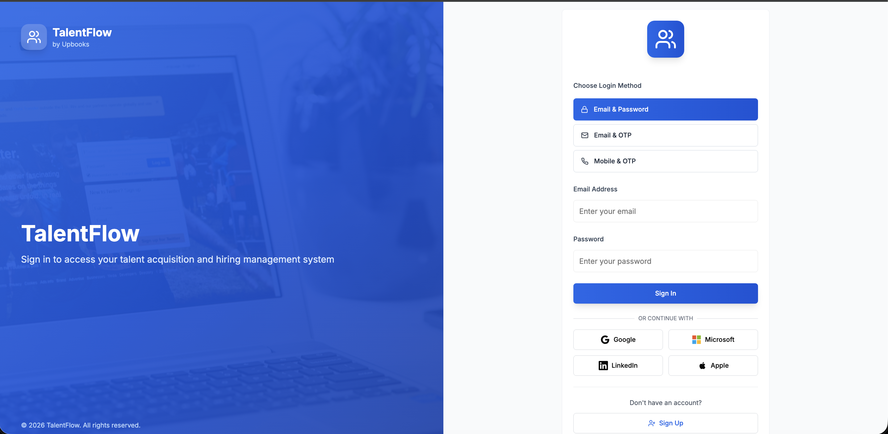 Sign in with email, OTP, or Google/Microsoft/LinkedIn/Apple. Choose which company to work in when you belong to multiple organizations.